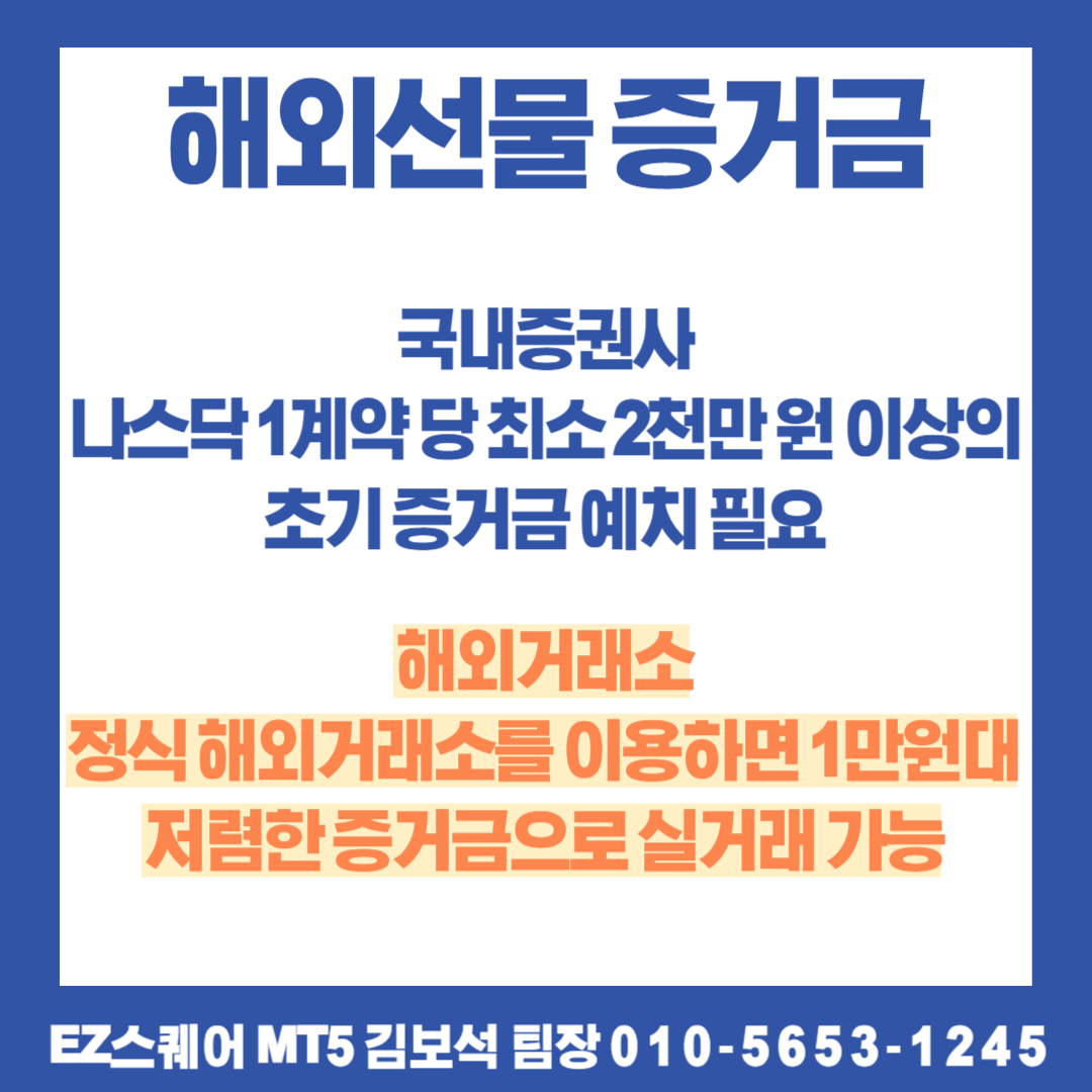 키○증권, 삼○증권 등 대형증권사를 통해 거래하는 방법입니다. 안전하다는 장점이 있지만, 수수료가 비교적 높고 초기 증거금으로 2000만 원 이상을 예치해야 한다는 부담이 있습니다.