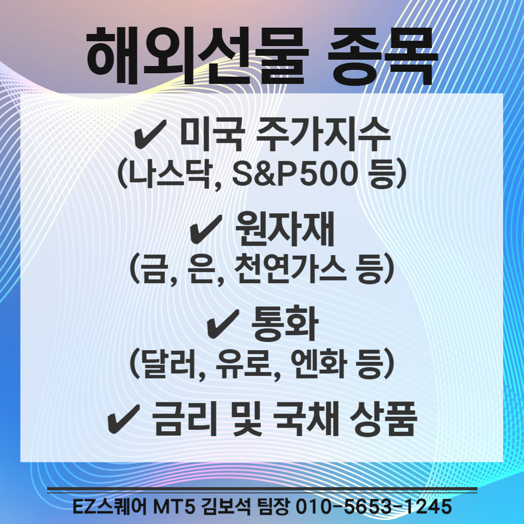 해외선물은 미국 주가지수(나스닥, S&P500, 다우존스 등), 통화, 원자재, 금리 상품 등을 미래의 특정 시점에 정해진 가격으로 거래하는 파생상품입니다.