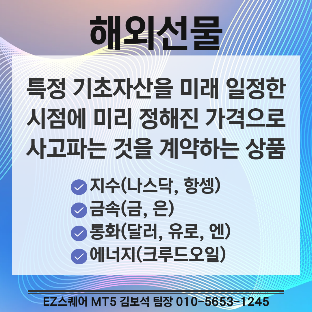 이런 식으로 선물 시장에서도 금, 은, 통화, 지수 등을 미리 정해진 가격으로 거래하는 계약이 바로 해외선물입니다.