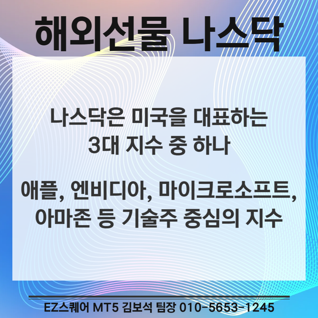 나스닥은 미국을 대표하는 3대 지수 중 하나로 애플, 엔비디아, 마이크로소프트, 아마존 등 기술주 중심의 지수입니다.