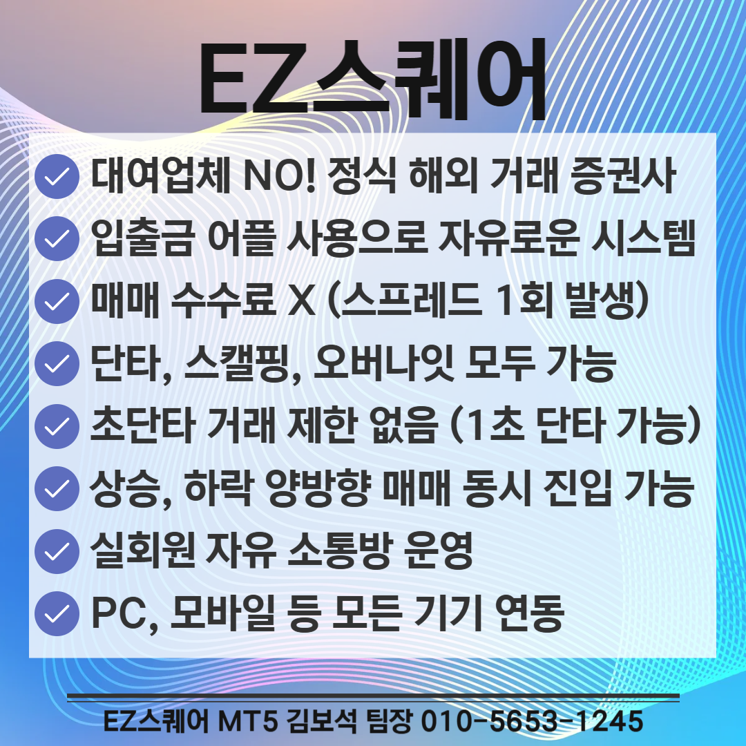 안전하고 투명한 환경에서 해외선물 거래를 시작하고 싶으신 분들은 EZ스퀘어 김보석 팀장에게 편하게 문의하세요! (▼이미지 클릭)