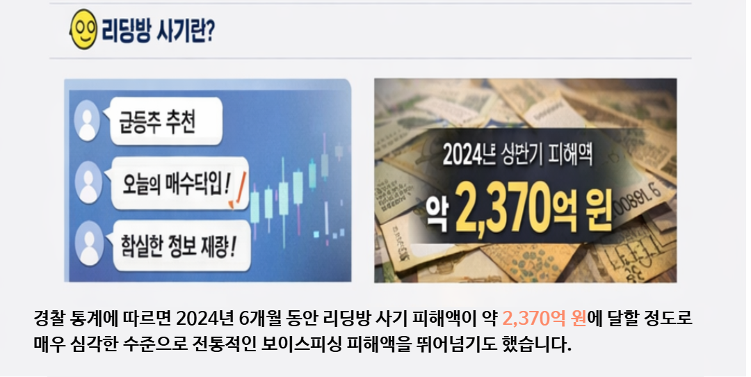 경찰 통계에 따르면 2024년 6개월 동안 리딩방 사기 피해액이 약 2,370억 원에 달할 정도로 매우 심각한 수준으로 전통적인 보이스피싱 피해액을 뛰어넘기도 했습니다.