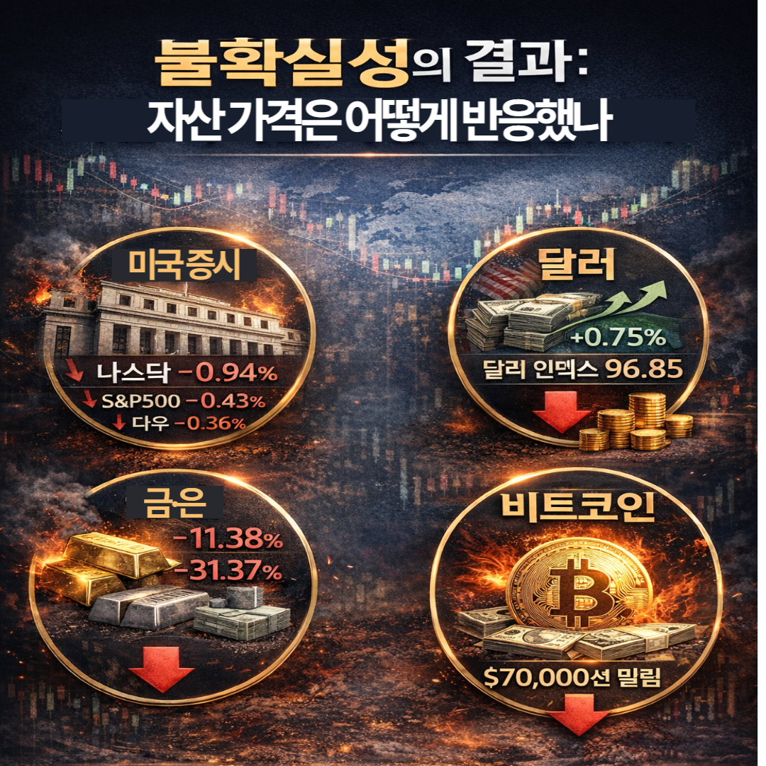 금·은·비트코인 같은 대체자산은 급락했고, 달러는 강세를 보였으며, 미국 증시 역시 일제히 하락했습니다. 이번 움직임의 핵심 키워드는 단 하나, 통화정책 불확실성입니다.