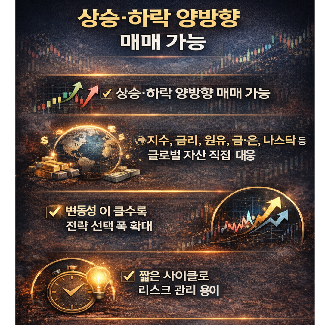🌍 또한 미국 지수, 금리, 원유, 금·은, 나스닥 등 전 세계 주요 자산을 직접 거래할 수 있어, 특정 종목이나 국내 시장에만 의존하지 않아도 됩니다. 초보자 입장에서는 “어떤 종목을 골라야 할지”에 대한 부담이 줄어드는 효과도 있습니다.