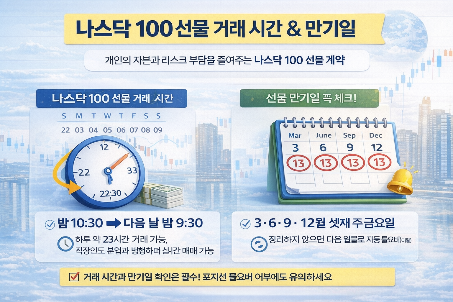 나스닥 100 미니·마이크로 선물은 소액으로도 글로벌 지수에 참여할 수 있고, 상승·하락 어느 방향에서도 대응이 가능해 변동성 장세에 유연하게 활용할 수 있는 상품입니다. 거래 시간 또한 길어, 직장인 투자자분들도 본업과 병행하며 시장을 체크할 수 있다는 점에서 실전 활용도가 높습니다.