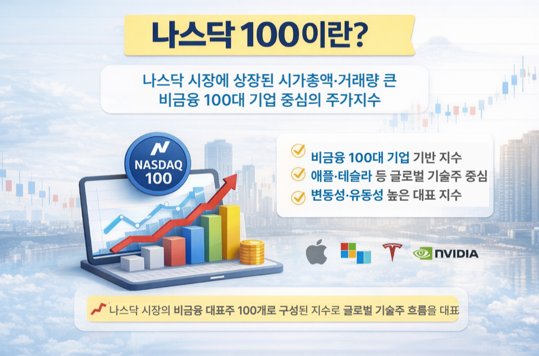 나스닥 100은 나스닥 시장에 상장된 비금융 기업 중 시가총액과 거래량이 큰 100개 기업으로 구성된 지수입니다.